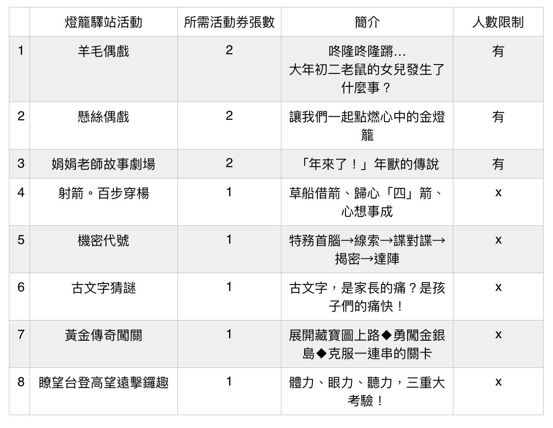 • 不同驛站所需活動券數不同,皆以⼈為單位,不分年齡,可⾃由選擇參與,採現 場候位制,逾時/額滿,請參加其他項⽬,不予退票。