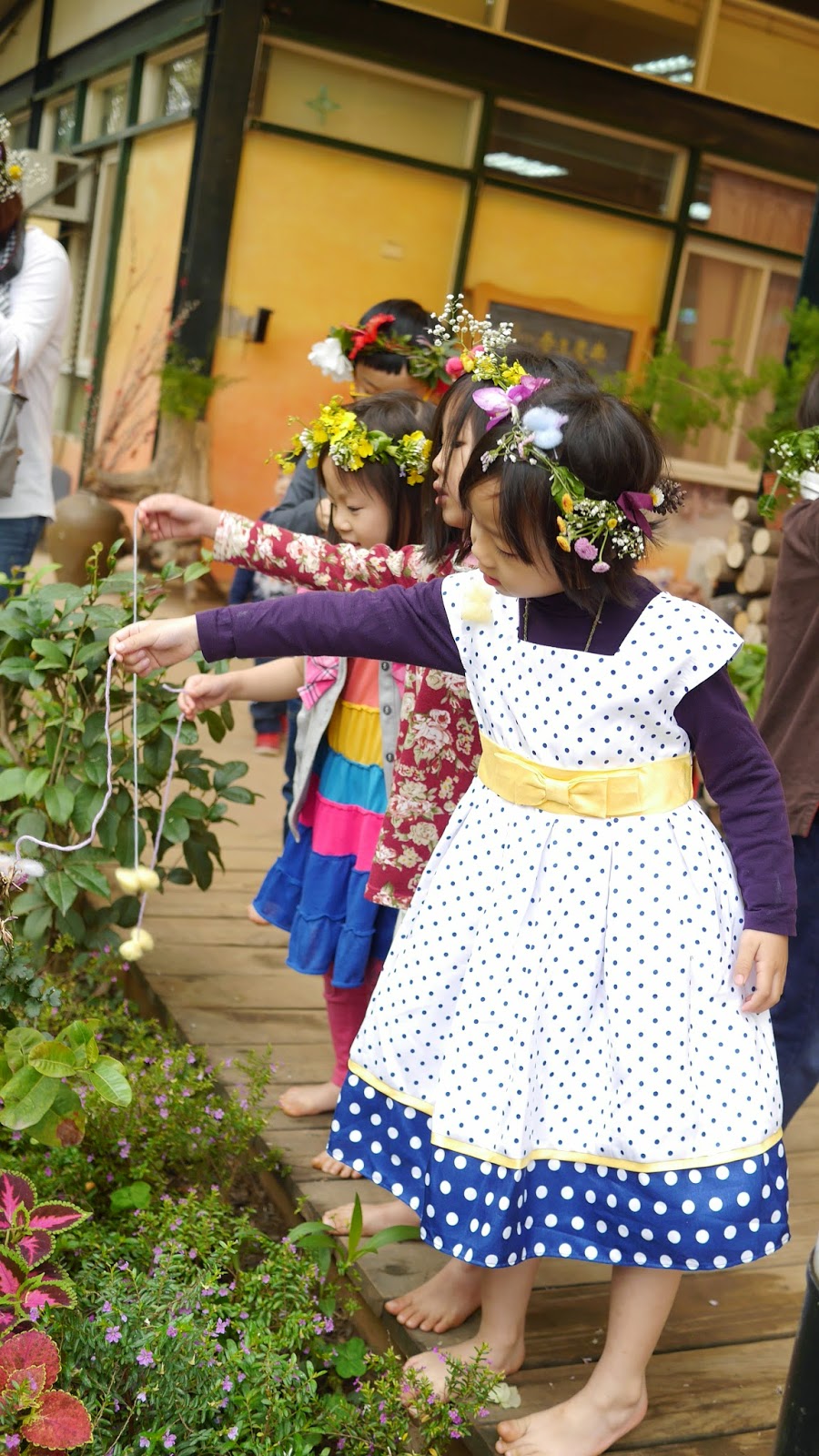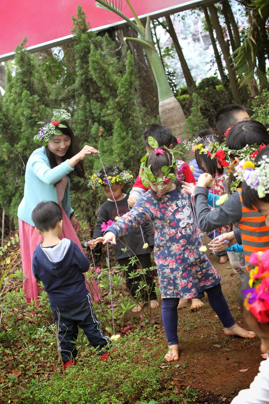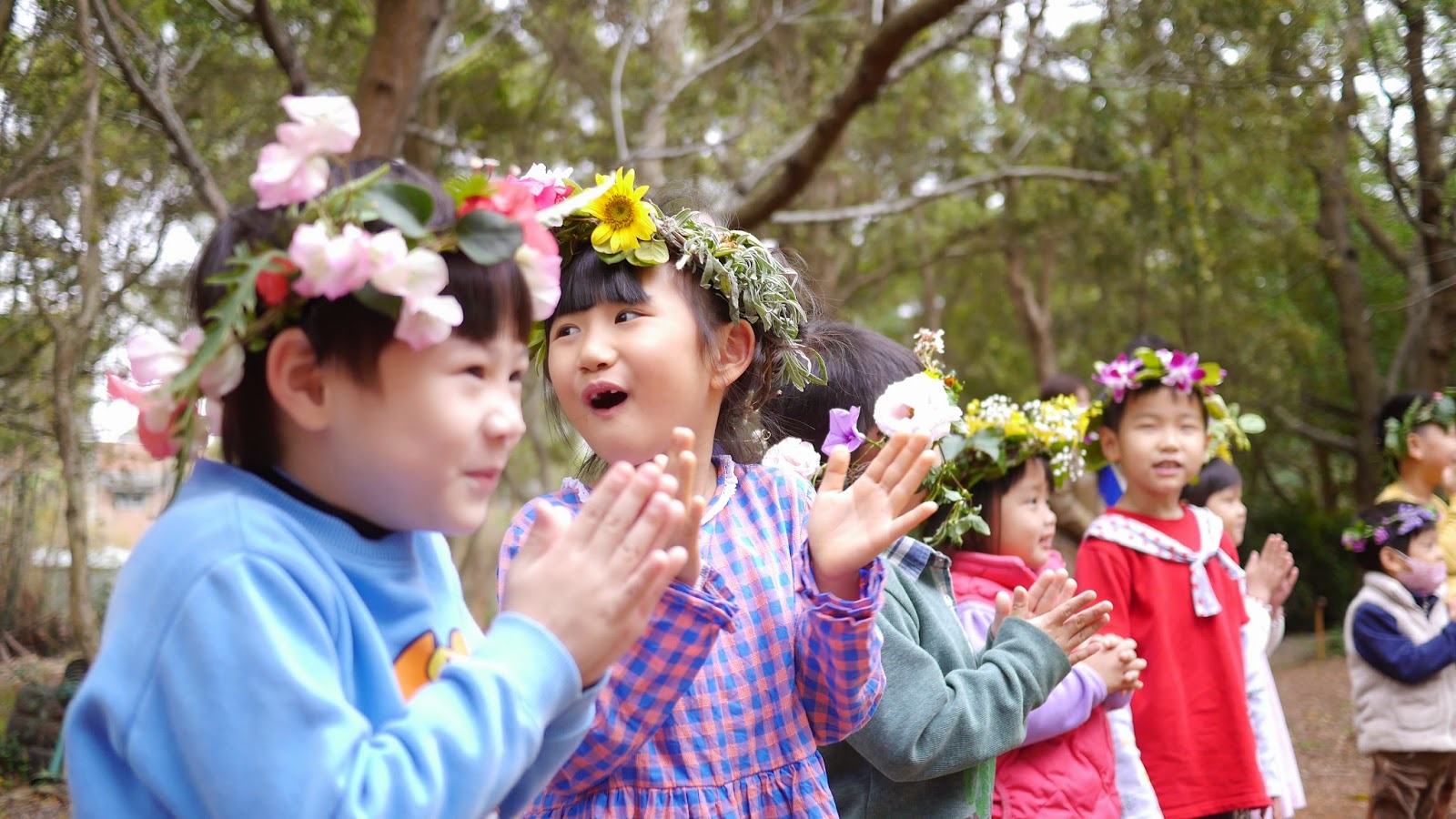慶典中,孩子們帶著家長共同預備的花圈一起歌頌春天,專注的欣賞著老師送給孩子們的祝福~編織舞,在編織與展開的過程中,孩子們驚嘆不已,頻頻傳來鼓掌聲。接著拜訪春牛、喚醒小種子、舞蝶及享用春盤,另有一群參與慶典的畢業生家長,辛勤的包著春捲,孩子們享用到了裡頭滿滿的祝福~勤勞.長長久久.興旺及家長滿滿的愛呢!