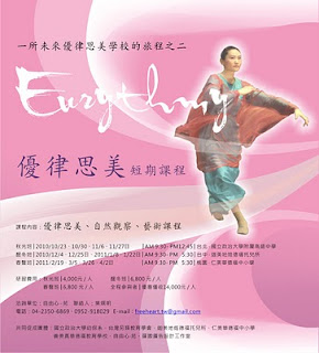 這個短期課程將會隨著季節來體驗優律思美在詩詞、在音樂中的呈現,各季節也將會以較深入的方式 ,就不同的層面、不同的內容來探討、研習相關的優律思美課程。除此之外,我們也將帶入人智學基本的自然觀察練習,以及不同的藝術課程。我們在預定上課的地區選擇了一個幽靜的地點,每次的課程時間也均會在週六進行,好讓優律思美展開一天的寧靜,讓您對深層自我的接觸有另外一個練習的方式,或只是給自己一個機會去享受詩歌、音樂的美好。