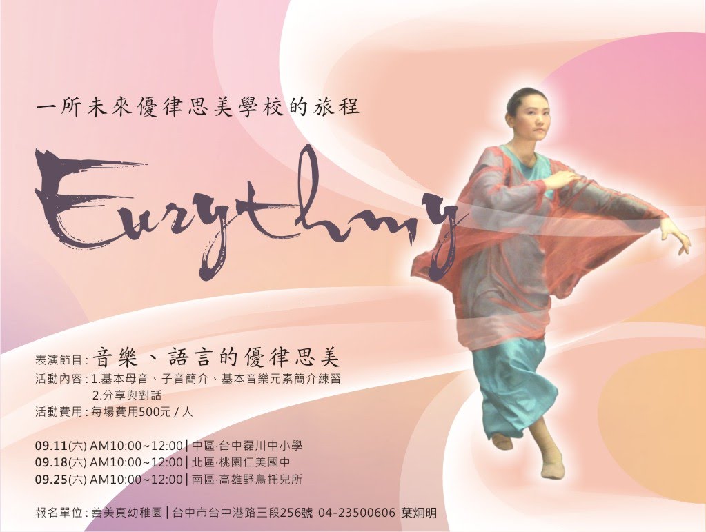 Eurythmy (優律思美) 此字源自希臘,意指和諧有韻律的動作,是在二十世紀初由奧地利哲學家魯道夫.史代納博士 (Rudolf Steiner) 所發展而來的一種獨特的表演藝術,也是華德福教育中的重要課程之一。優律思美看起來像舞蹈,其實不是舞蹈,而是一種新的很接近於舞蹈和默劇之間的藝術表達。在舞動的過程中,人與人之間必須密切合作,共同以肢體琢磨一句話該怎麼講、某段音樂該如何表達,以便讓語言及音樂所蘊藏的強大生命力在空間中表達出生命的實體,並培養創造出團體及個人與天地宇宙的和諧關係。